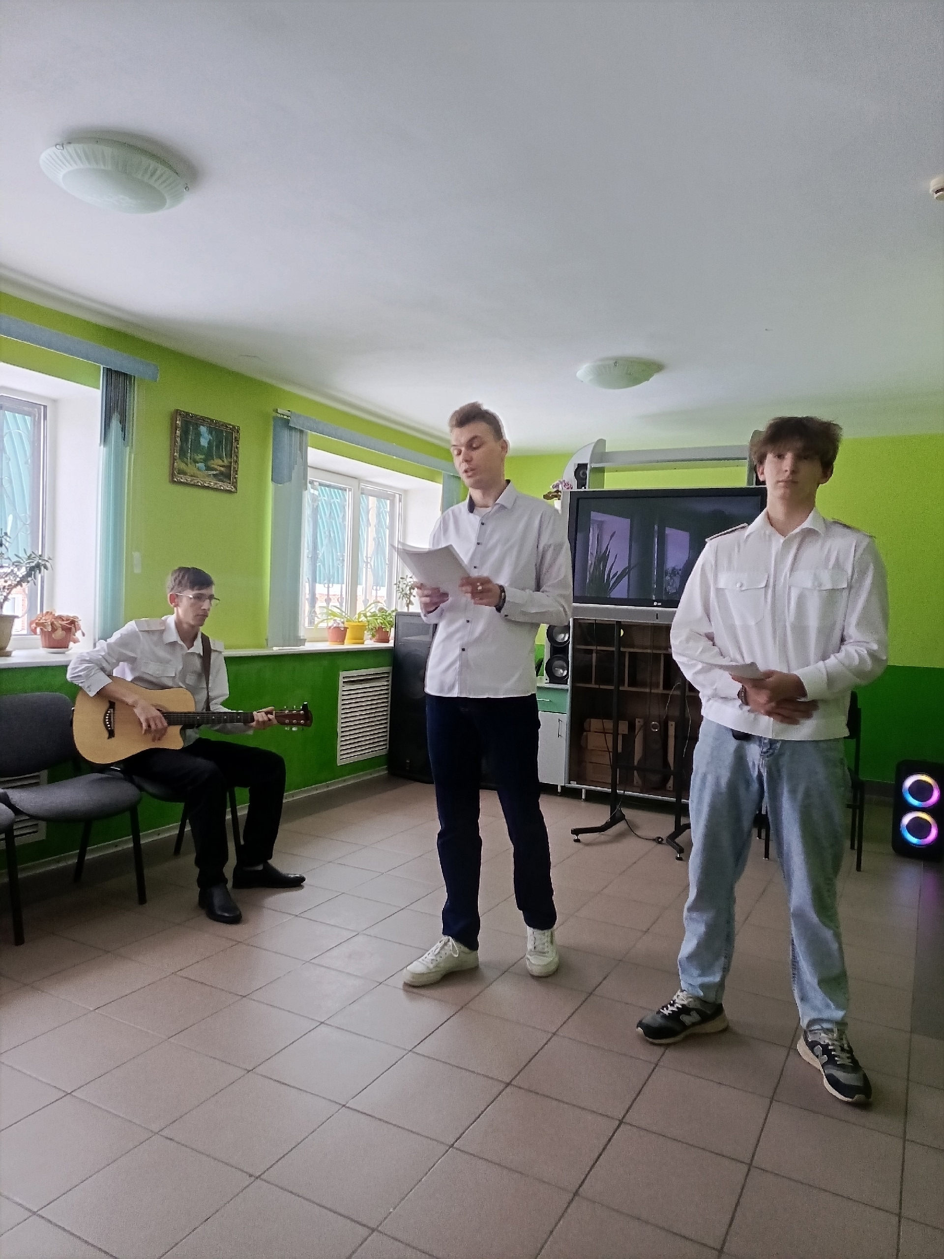 Ребята преподнесли поздравления под чарующие звуки гитары: прозвучали душевные стихи и песни, а под бурные аплодисменты был исполнен зажигательный танец. На протяжении всего вечера ведущие — Николай Потапов и Евгений Васильченко — щедро осыпали виновниц торжества комплиментами и добрыми пожеланиями. Праздник завершился приятным сюрпризом — россыпью сердечек из хлопушек.
